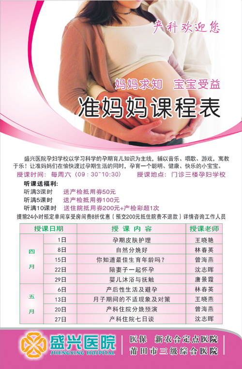 我院“孕婦學(xué)校”每周六上午開(kāi)課,聽(tīng)課人數30人以上,已有近萬(wàn)名孕婦受益。為答謝廣大孕婦對醫院支持與信任,推出各項優(yōu)惠政策: