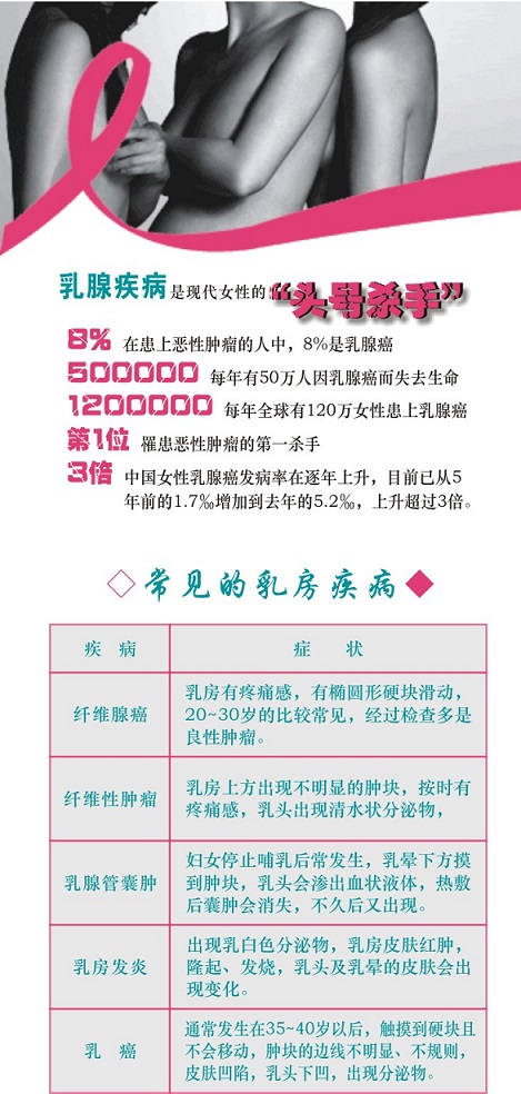 乳房對于每個(gè)女人都很重要,要好好維護它的健康。忙碌的女性應該留意自己的胸前動(dòng)向,養成良好的定期專(zhuān)業(yè)檢查的好習慣。長(cháng)久的掉以輕心往往耽誤早期的發(fā)現和治療,使保乳手術(shù)“望乳興嘆”;只有定期到專(zhuān)業(yè)醫院進(jìn)行深入的檢查才是“真正的保乳意識”。