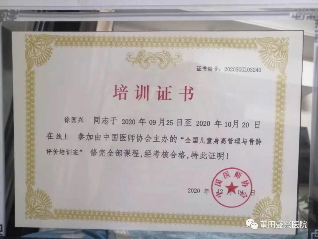 2020年師從莆田市第一醫院李金水主任,進(jìn)修學(xué)習“矮小癥、性早熟”相關(guān)知識,對“矮小癥”、“性早熟”診療能夠熟練掌握。并順利通過(guò)國家醫學(xué)委員會(huì )舉辦的第20屆骨齡學(xué)習培訓班,并取得骨齡評定合格證書(shū)。